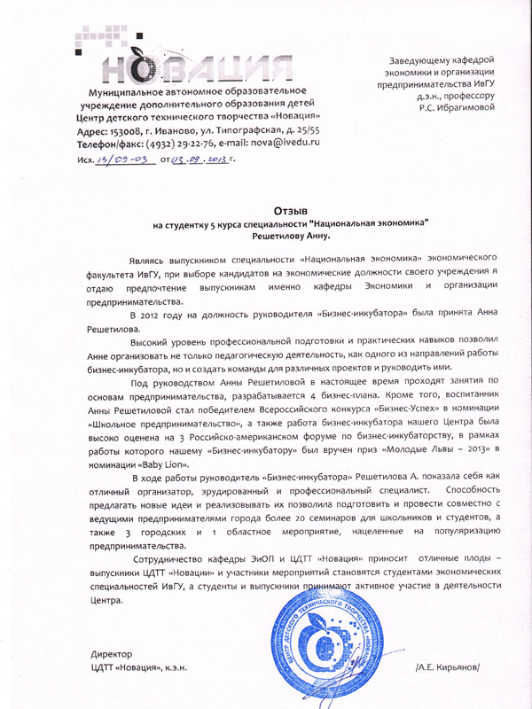 Кафедра ЭиОП активно применяет метод Проектного обучения, ориентированный на решение практических задач реальных предприятий. В ходе работы над исследовательским проектом обучающиеся стремятся узнать как можно больше о данной теме и найти эффективное решение проблемы, которое затем выносится на суд специалистов-практиков. Ежегодно в рамках дисциплины «Бизнес-коммуникации» команды студентов 3 курса под руководством доц. Кирьянова Алексея Евгеньевича выполняют проекты по разработке коммуникационной стратегии для фирм г. Иваново. Кафедра получает многочисленные благодарности от руководителей и собственников предприятий за помощь в разработке коммуникационной политики.