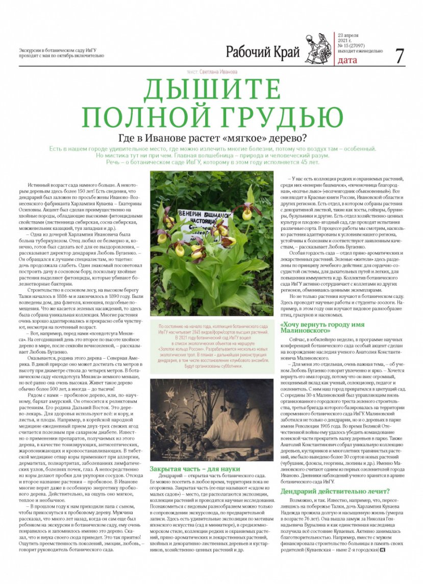 Юбилей Ботанического сада ИвГУ широко освещается в ивановских СМИ. Действительно, трудно пройти мимо такого знаменательного события и уникального места. В свежем номере газеты «Рабочий край» вышел большой материал о нашем саде, где рассказывается о его истории, коллекциях, научных традициях и рекреативных возможностях.
